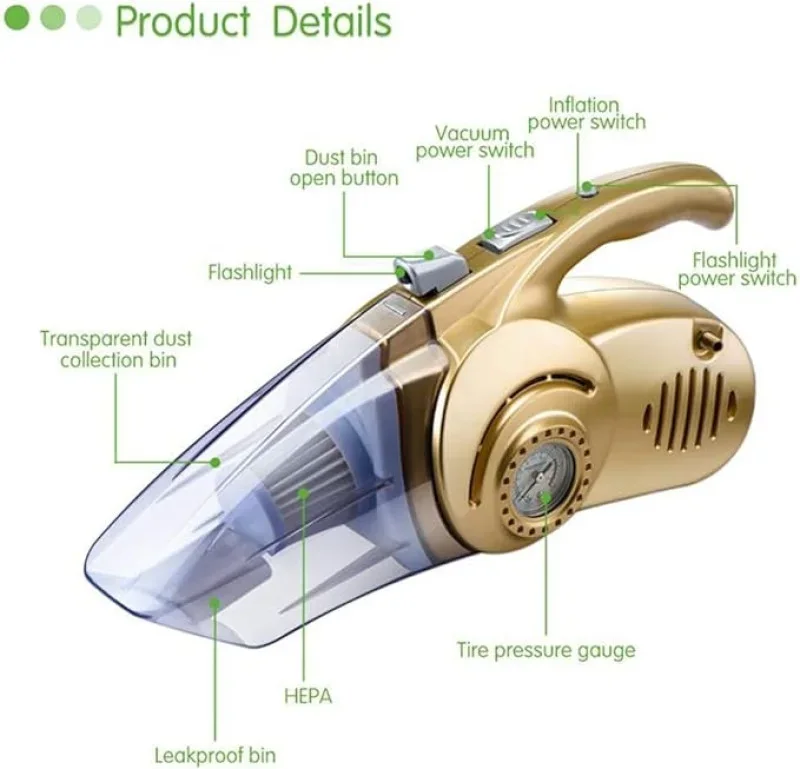 4 في 1 متعددة الوظائف: مكنسة كهربائية قوية 12 فولت للسيارة مع 12 فولت و120 واط؛ مع منفاخ الإطارات يمكنك نفخ الإطارات في أي وقت وفي أي مكان. يمنع مقياس ضغط الإطارات زيادة الملء، ويساعد ضوء ليد على تشتيت الظلام.